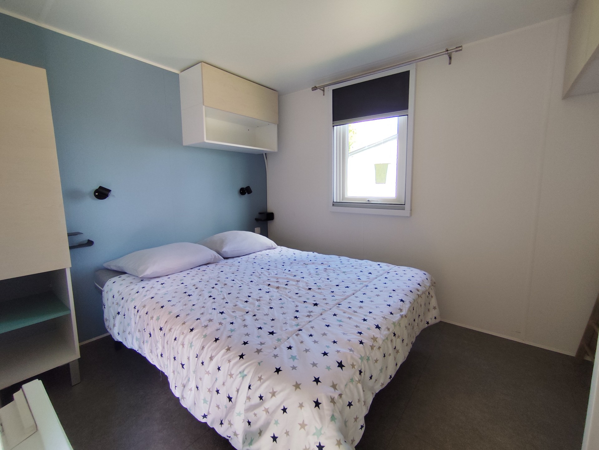 Model 2 ergonomic rooms with a bright living room which emits a soft atmosphere in a seaside spirit. These two mobile homes are composed of a master bedroom of 140 * 200 cm and a bedroom with two 80 * 190 cm beds, an equipped kitchen and a large number of storage spaces as well as an integrated terrace.