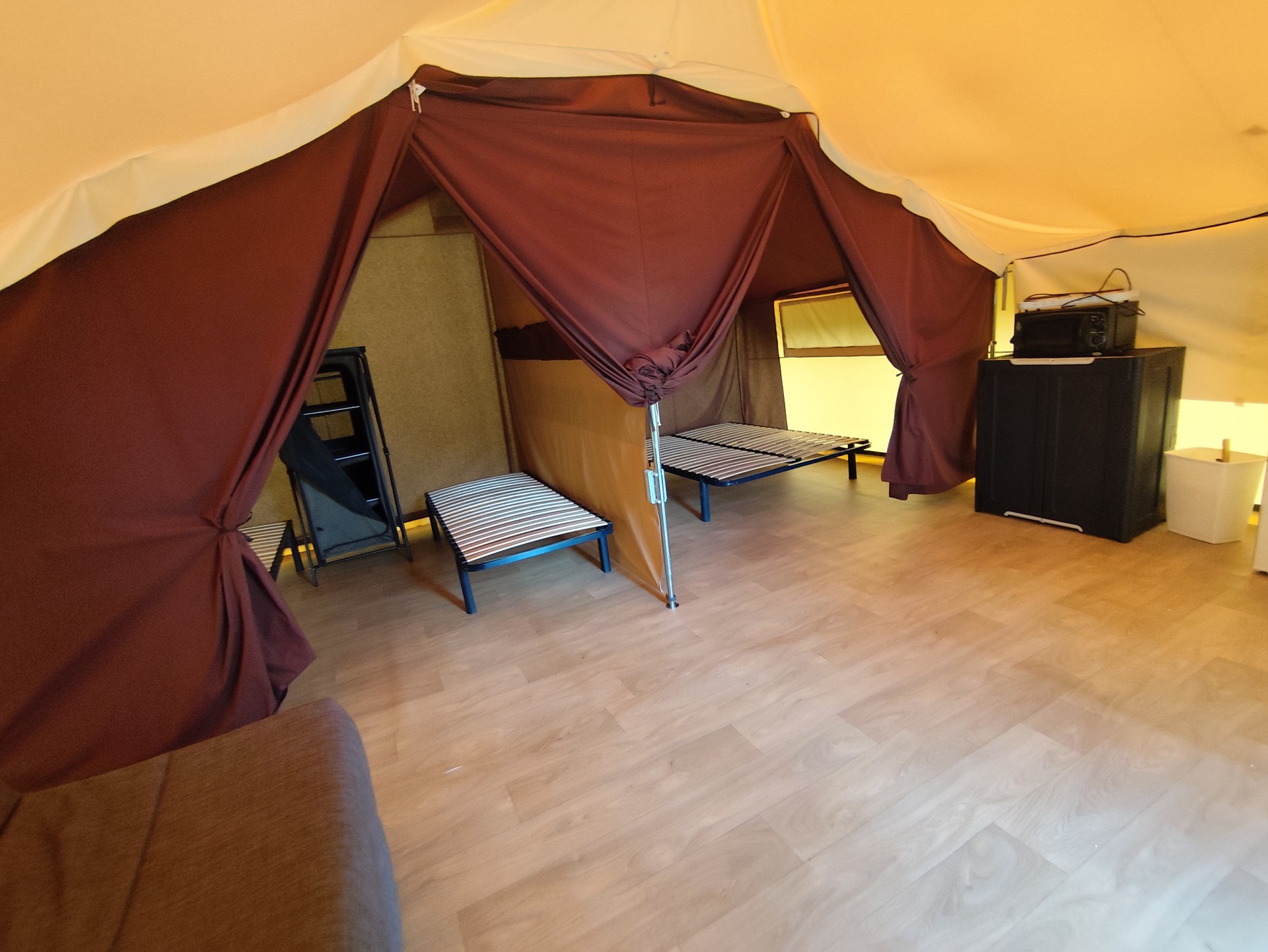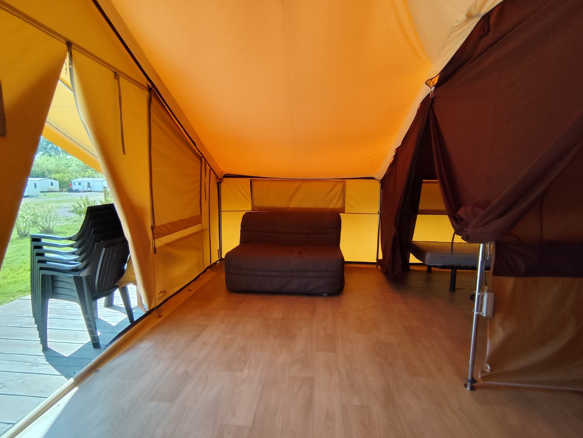 Real family model, comfortable and spacious tent installed on a wooden floor can accommodate up to 6 people with an area of 25 M2 with 2 bedrooms, a living room and a covered terrace of 8 M2 as well as a practical and functional kitchen area.